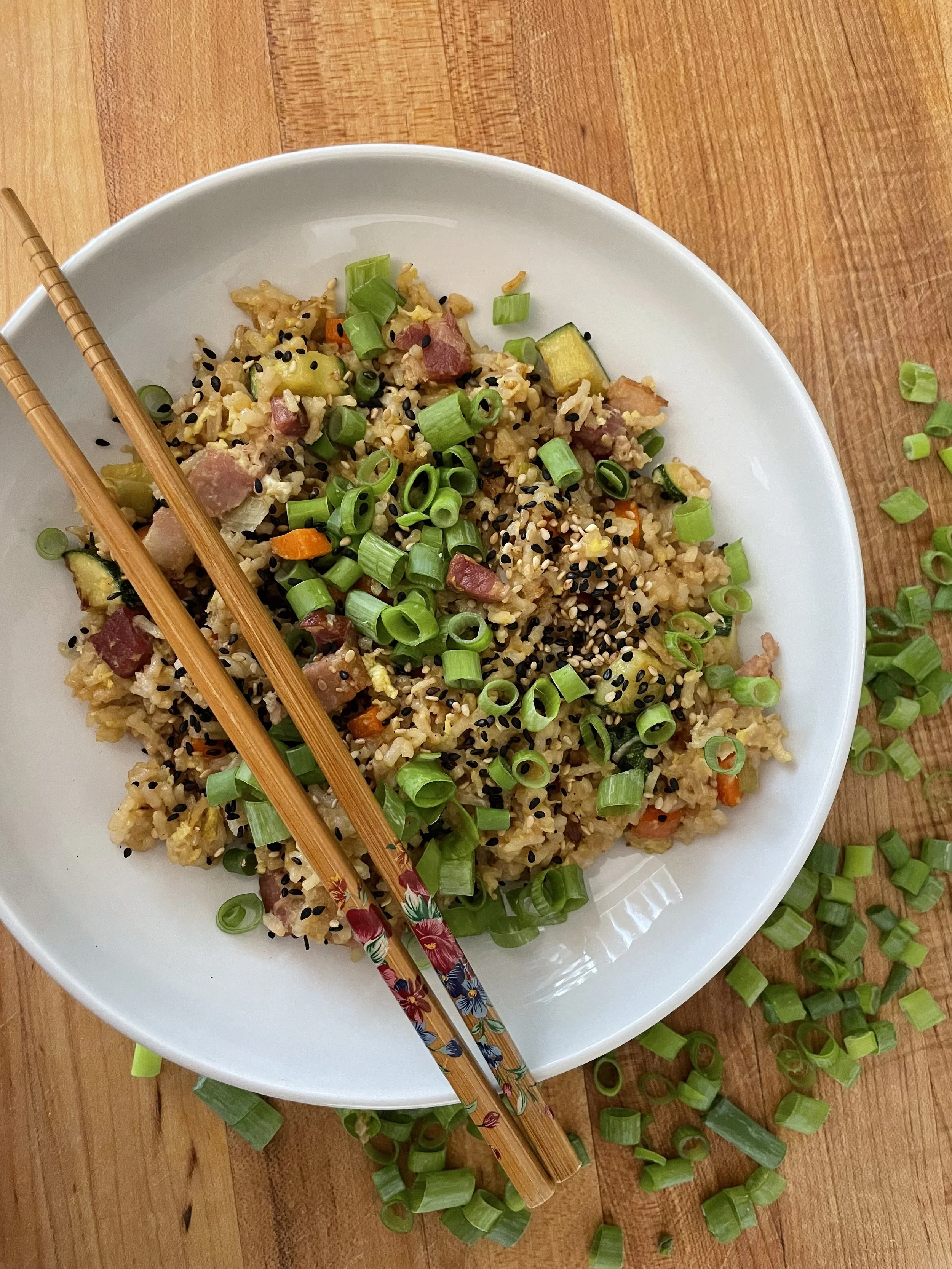 Cauliflower fried “rice” with shrimp, carrot, cabbage, mushroom, and coconut aminos sauce