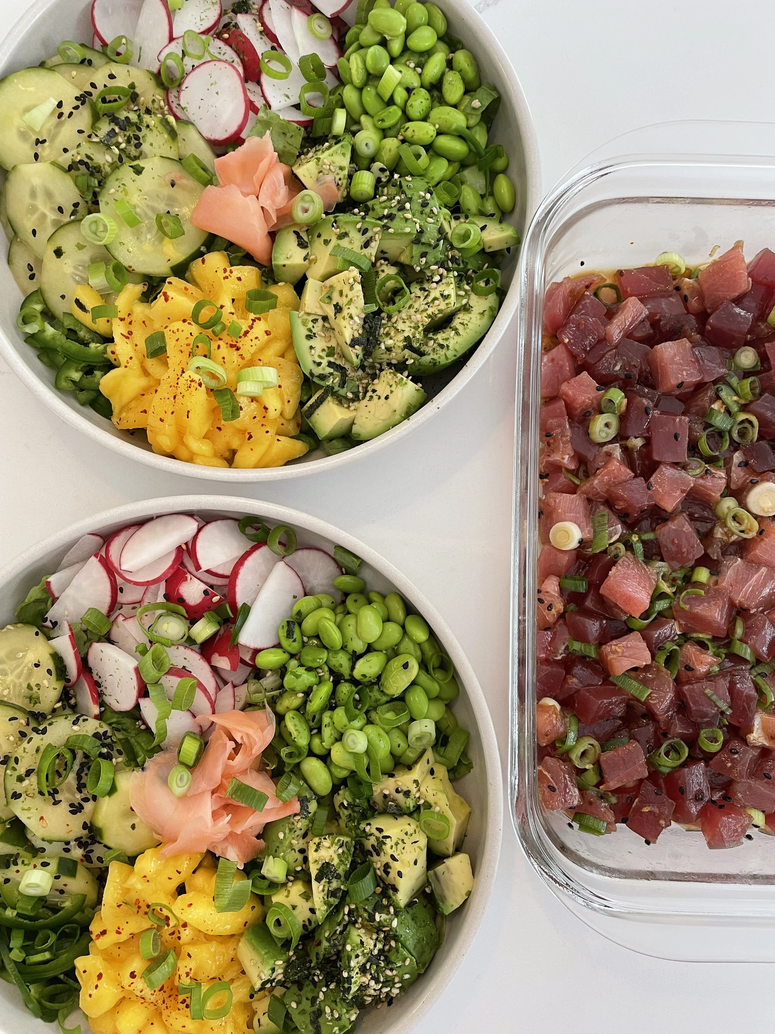 Ahi tuna poke bowls, furikake brown rice, pickled cucumbers, edamame, avocado, soy sesame sauce